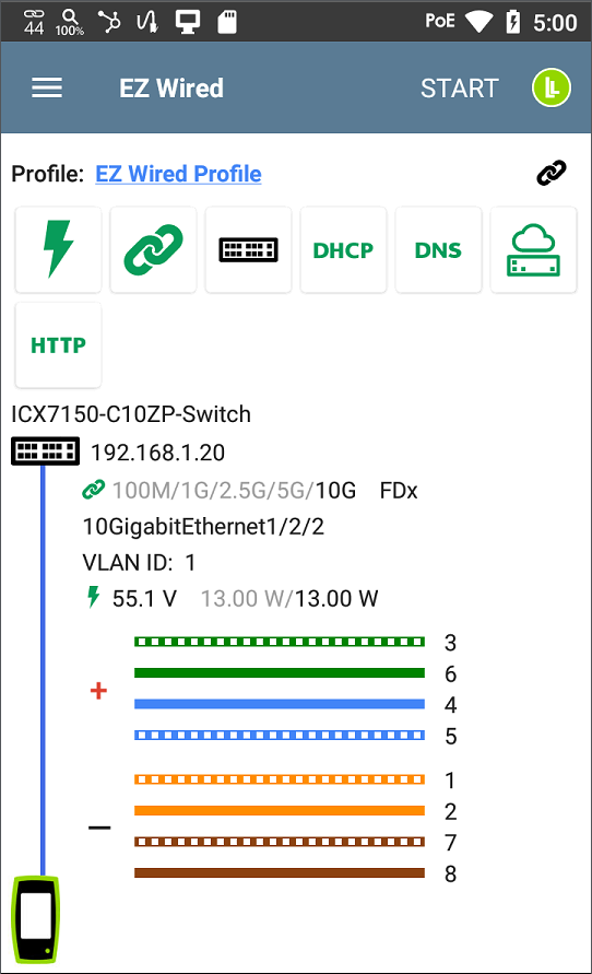 Ověřuje napájení přepínačů a kabelů přes Ethernet až do 90 W 802.3bt pomocí zátěžového testu TruePower™.
